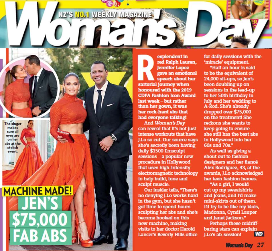 An insider tells, “There’s no denying J.Lo works hard in the gym, but hasn’t got time to spend hours sculpting her abs and she’s become hooked on this new machine, making visits for daily sessions with the ‘miracle’ equipment.”” J.Lo, Woman’s Day
